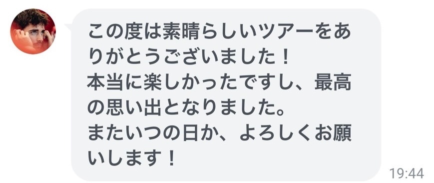 この度は丁寧かつ楽しいガイド&カーチャーターをありがとうございました。皆さんのおかげで慣れぬ子連れ滞在を楽しく、豊かに過ごすことが出来ました。アスティカさん、ビンビンさん、ウェルキスさん、リキさん(ジェレミさん)、ハムハムさんにもどうかお礼をお伝えください。